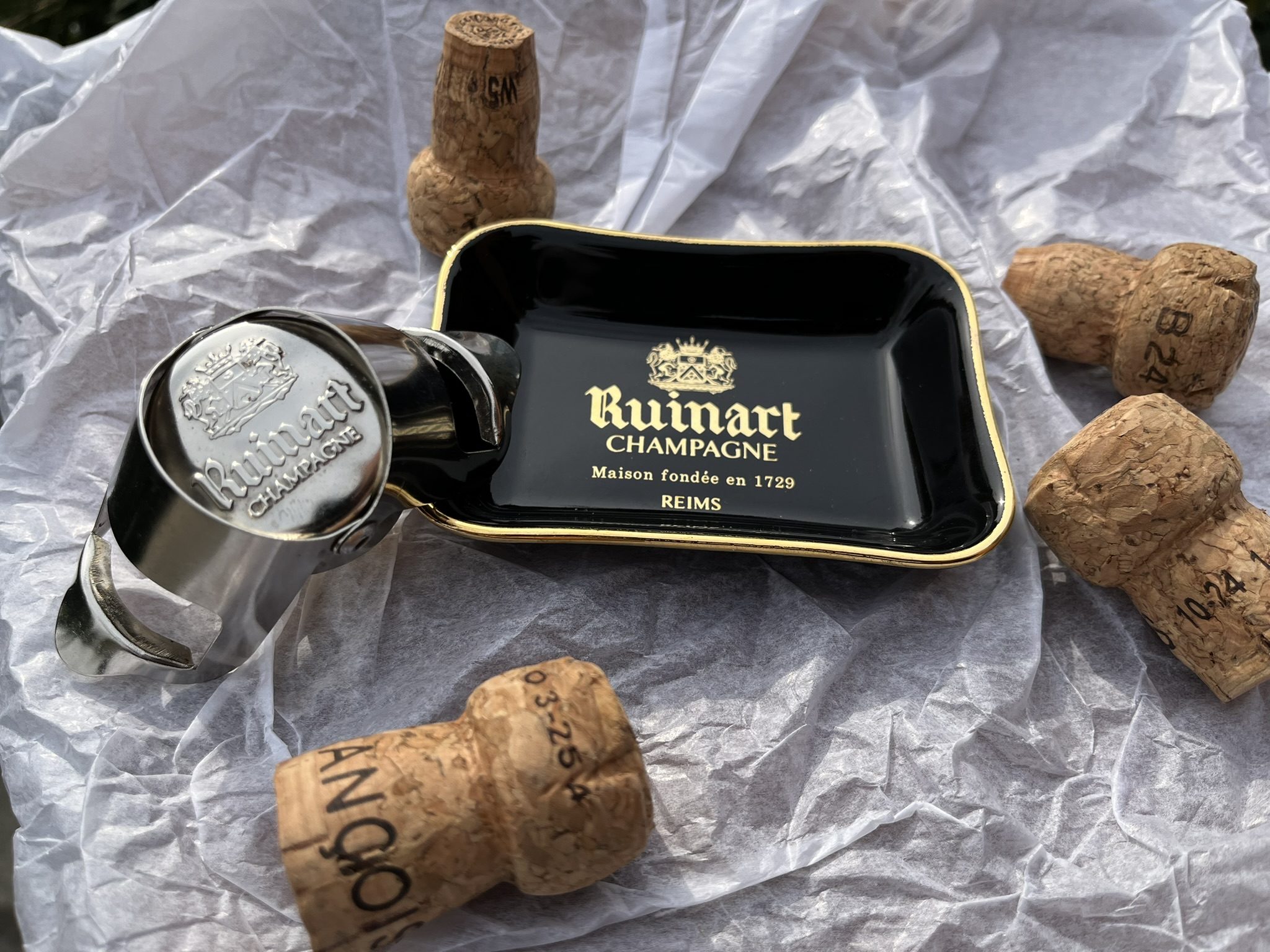 2-piece Ruinart vintage set – ceramic dish + champagne bottle stopper (Made in France, circa 1980)