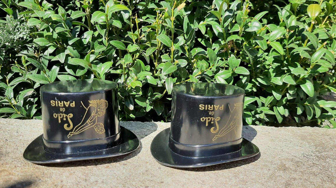 For sale: two wonderful and rare original Bakelite top hat–shaped ashtrays from the glamorous world of the famous Lido cabaret in Paris.