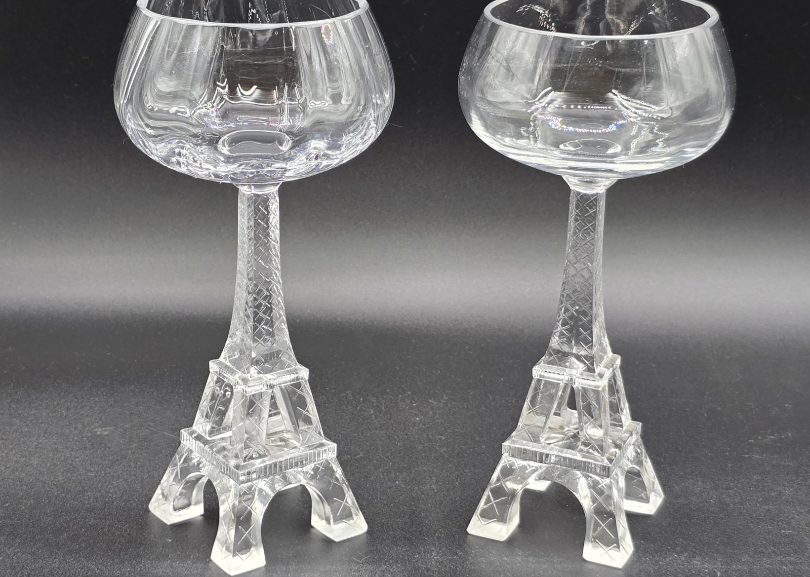 A set of 2 crystal champagne / wine glasses. The stems are shaped like the Eiffel Tower, with finely detailed design. The bowls feature vertical optical ribs.