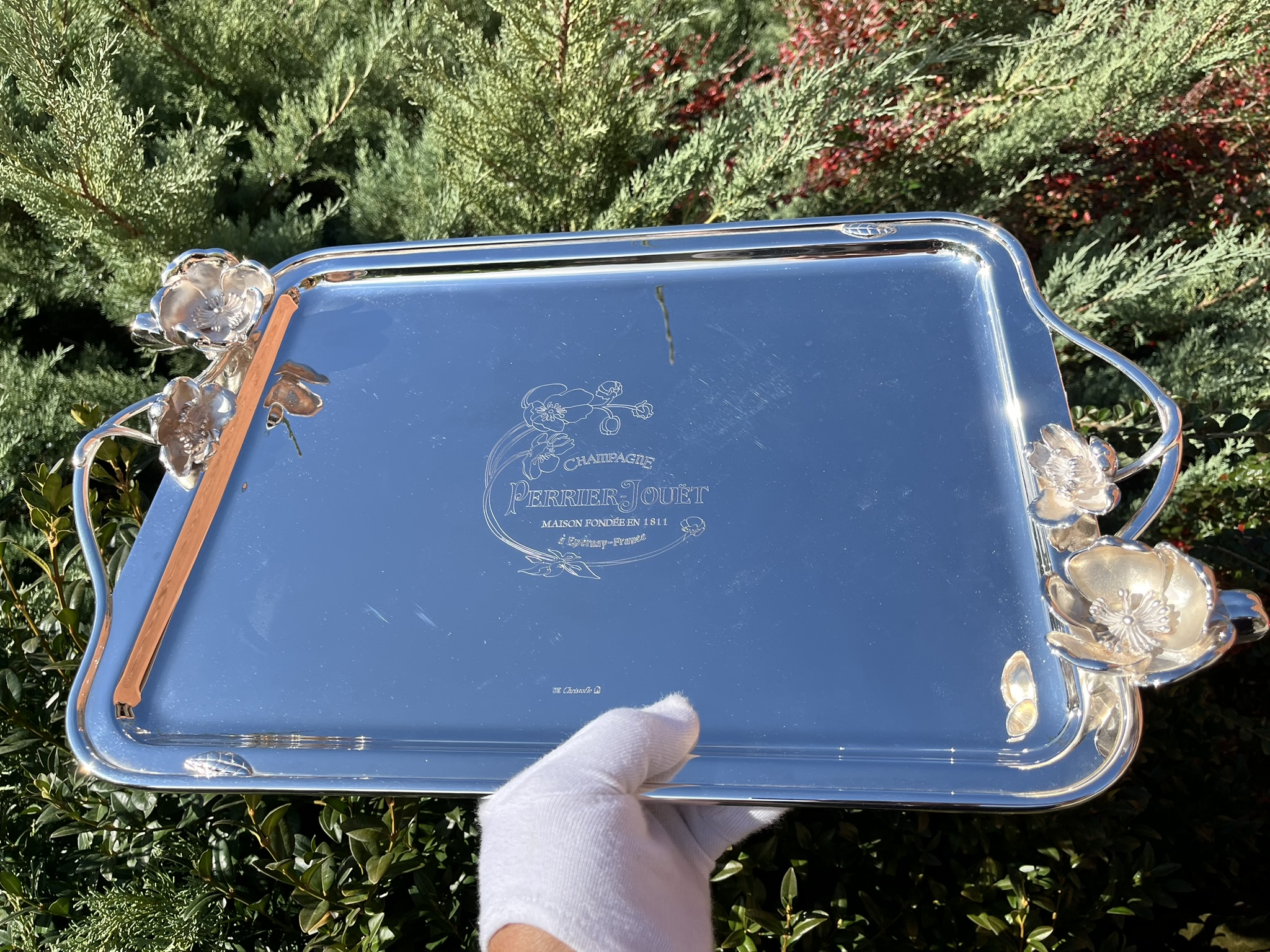 An exceptional collaboration between two legendary French houses: the renowned silversmith Christofle and the prestigious Perrier-Jouët Champagne Maison joined forces to create this exclusive rectangular silver-plated tray. The tray features two elegant stem-like handles inspired by fully bloomed anemones.