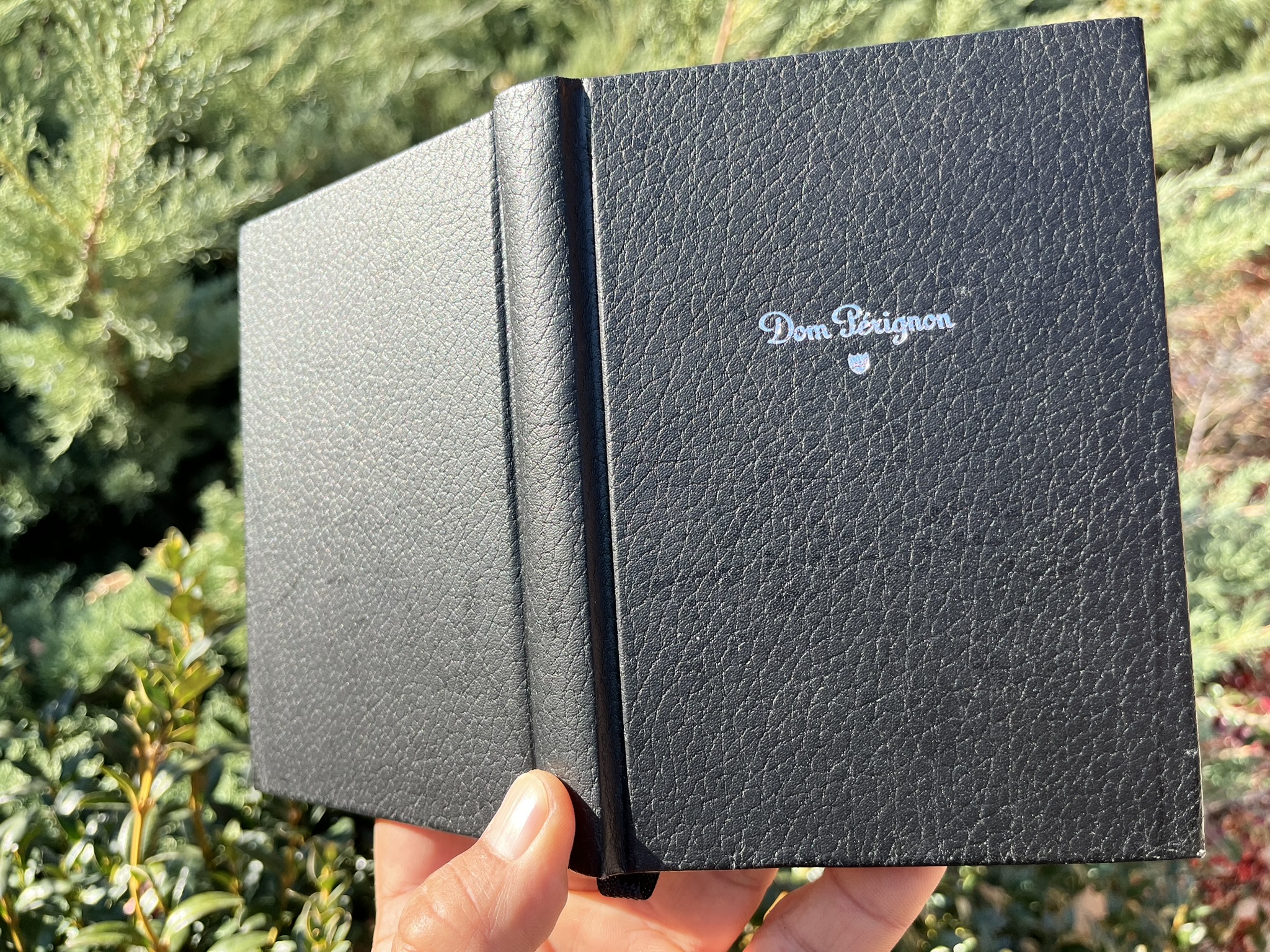 The notebook is made with high-quality paper, with subtle Dom Pérignon logos and refined graphic elements adorning the inner covers and pages. Perfect for note-taking, as a travel journal, or as an exclusive gift for champagne lovers and collectors.