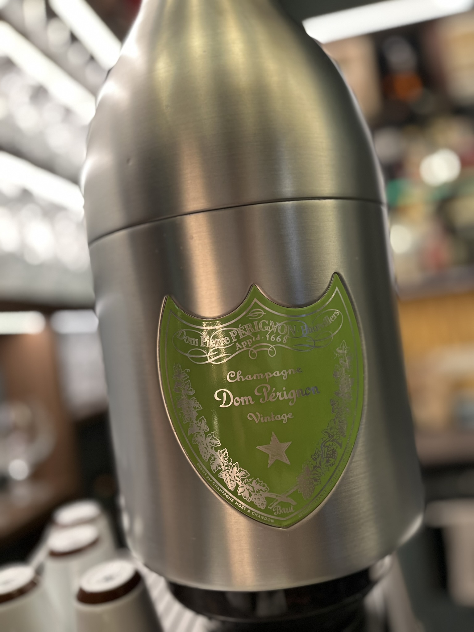 Alumíniumból készült, szürke kivitelben, elülső részén zöld színű Dom Pérignon emblémával.