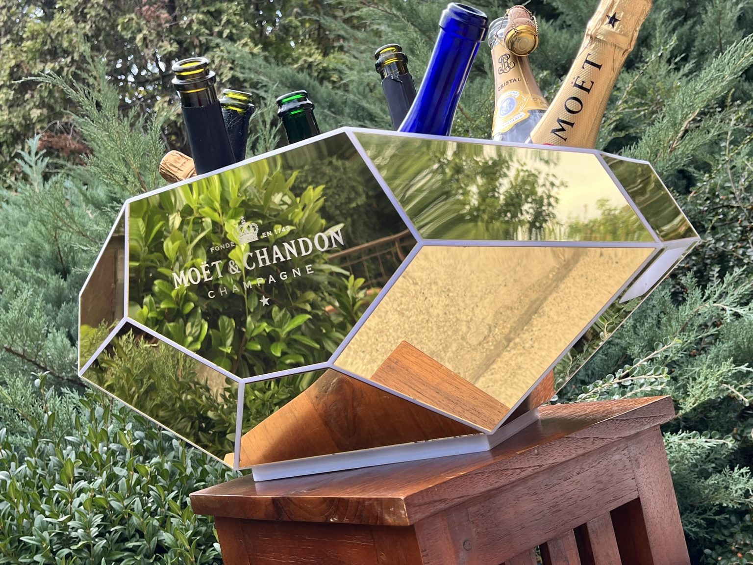 This striking gold “Diamond Night” champagne cooler ice tub is a limited edition piece by Moët & Chandon, designed to impress with both its elegant appearance and generous size.