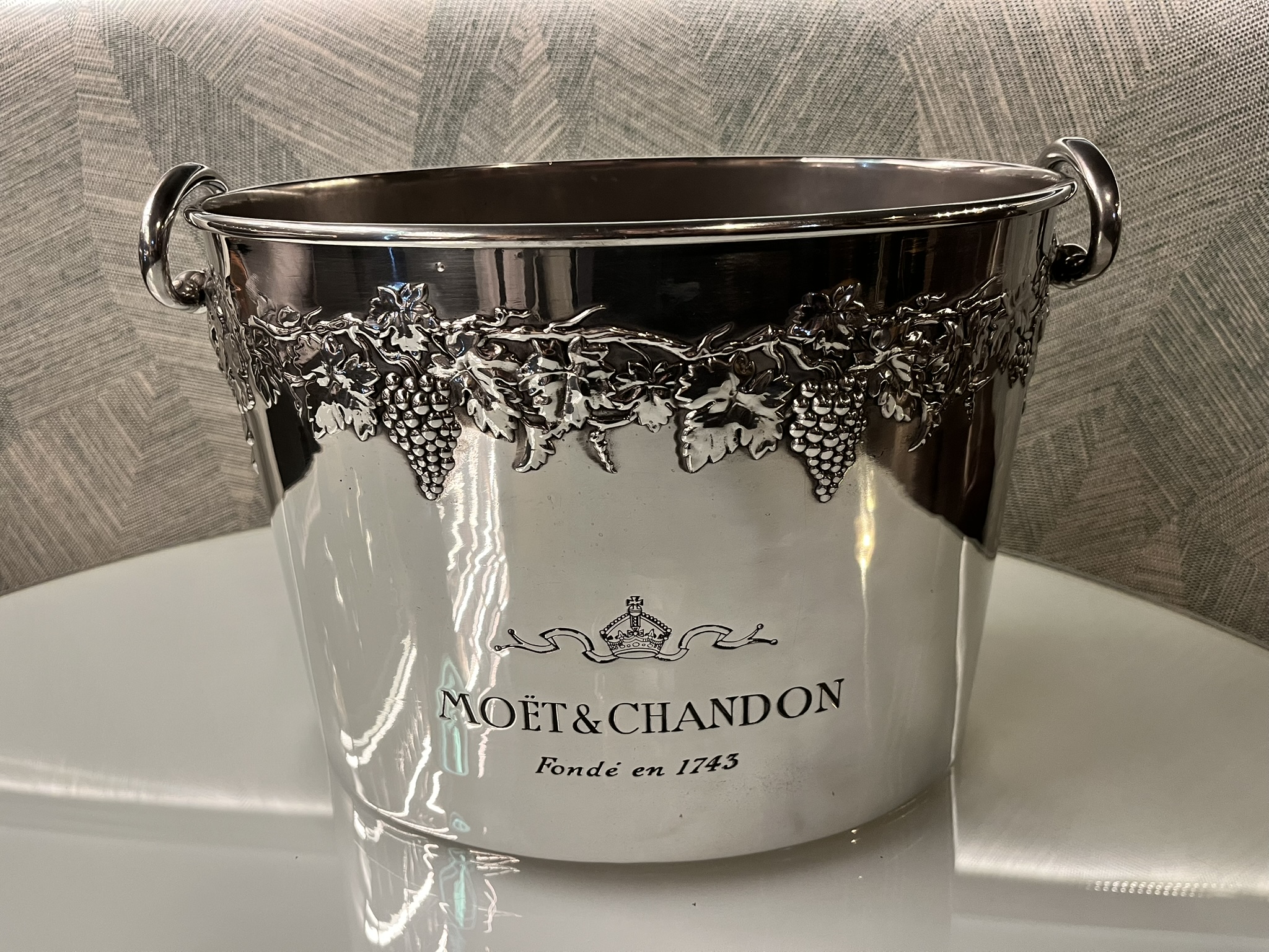 Ovális formájú, elegáns Moët & Chandon pezsgőhűtő, ónból készült Franciaországban, szőlőfürtökkel és gyűrű alakú fülekkel díszítve.