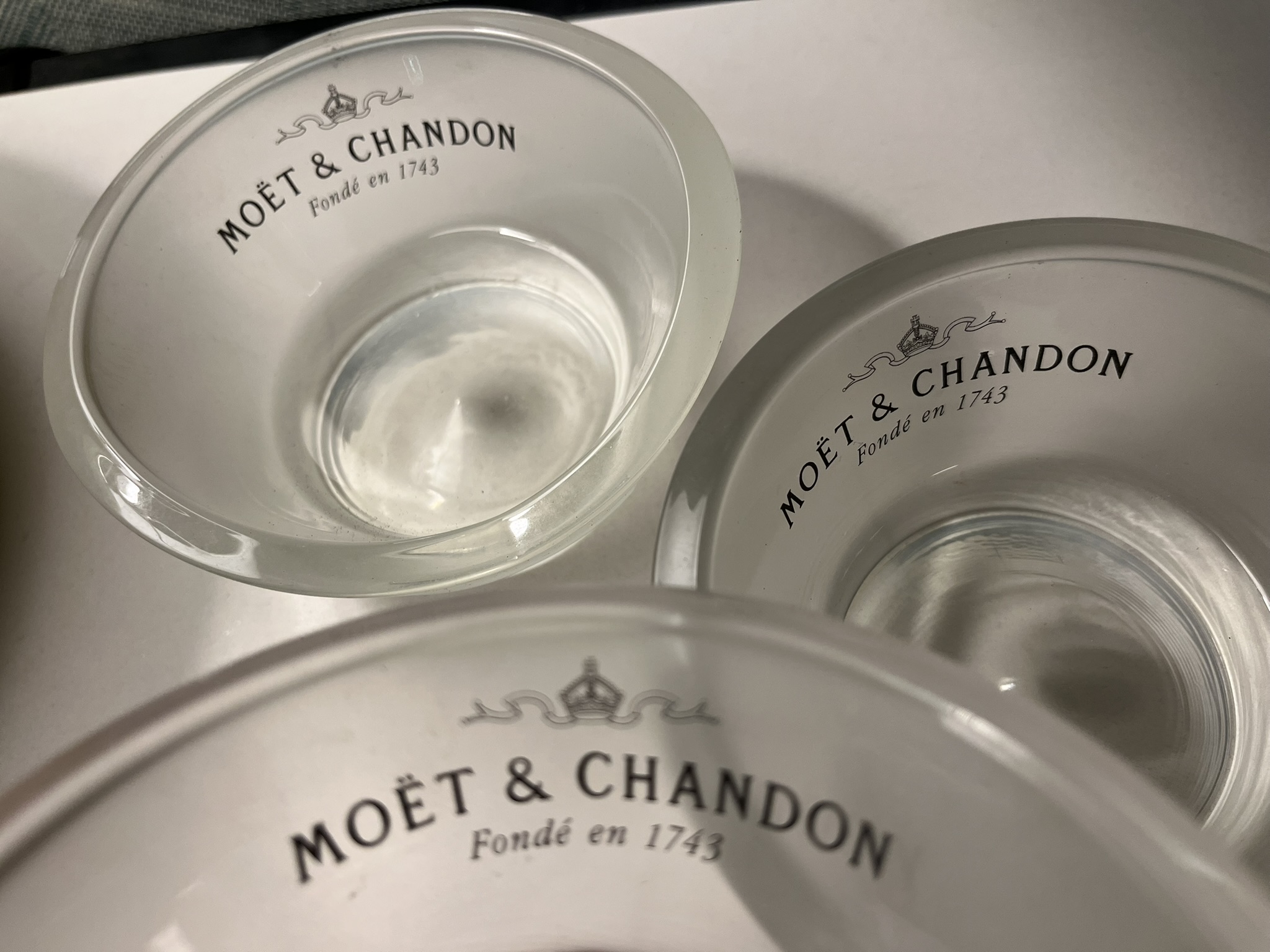 All three bowls are in very good vintage condition with no chips or cracks—only minimal signs of age-appropriate wear. Each piece carries the Moët & Chandon attribution mark, confirming their authenticity and premium quality.