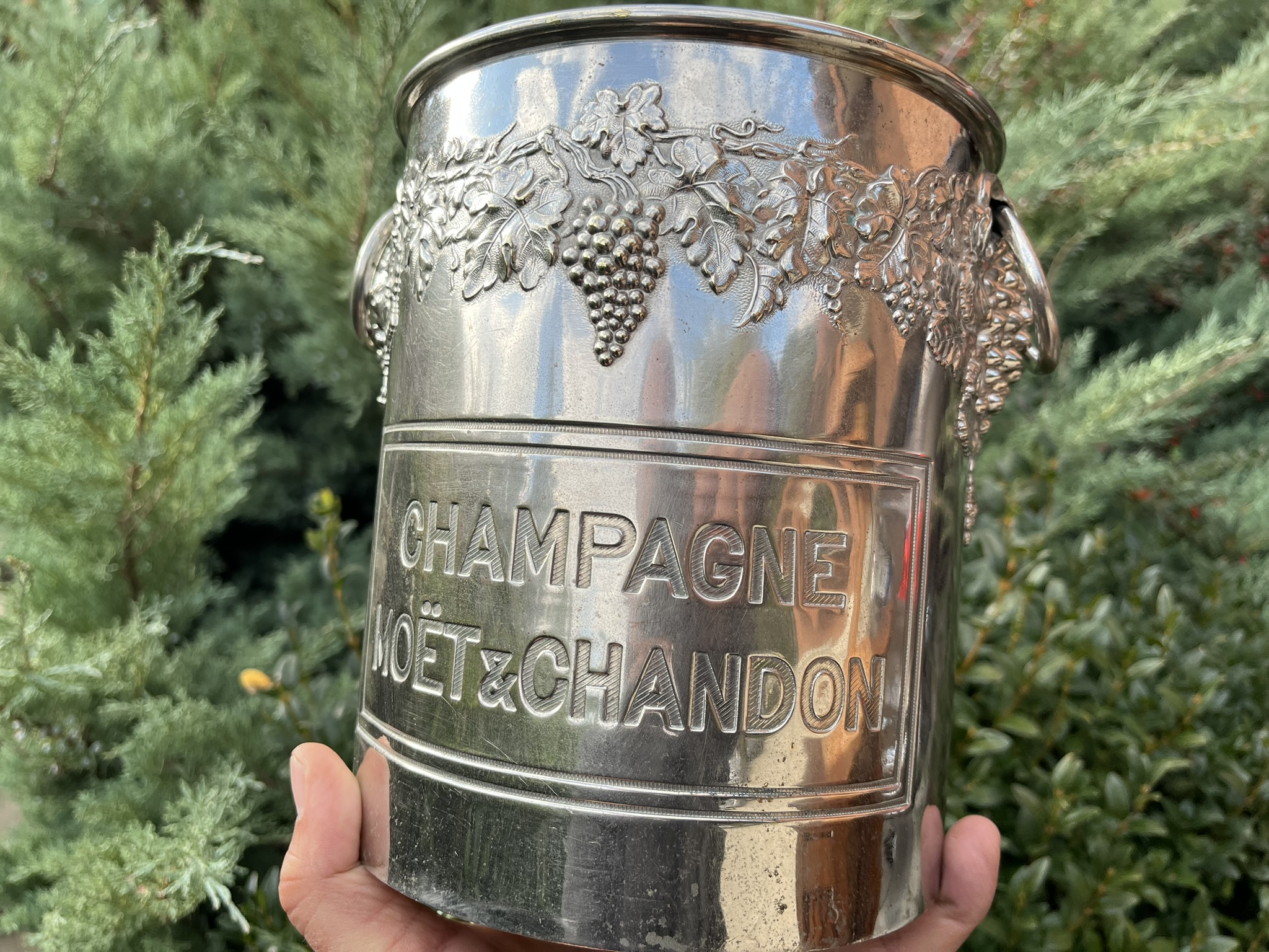 Crafted in France from silver-plated copper, the cooler displays refined Art Deco lines, elegant proportions, and timeless sophistication. The upper rim is beautifully adorned with finely detailed grape and vine-leaf motifs, while two side handles add both balance and character. The Moët & Chandon name is proudly stamped on both sides, just as it would have appeared in prestigious French brasseries and grand hotel bars of the early 20th century.
