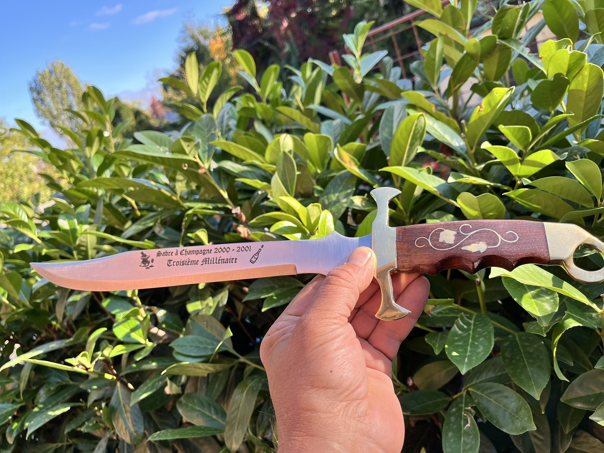 Különleges, emlék pezsgőkard (sabrage kard) eladó, amelyet a 2000-es év, azaz a harmadik évezredbe való átlépés alkalmából készítettek. A kard a klasszikus francia sabrage hagyomány előtt tiszteleg – ez az a látványos pezsgőbontási szertartás, amelynek eredete Napóleon koráig nyúlik vissza.
