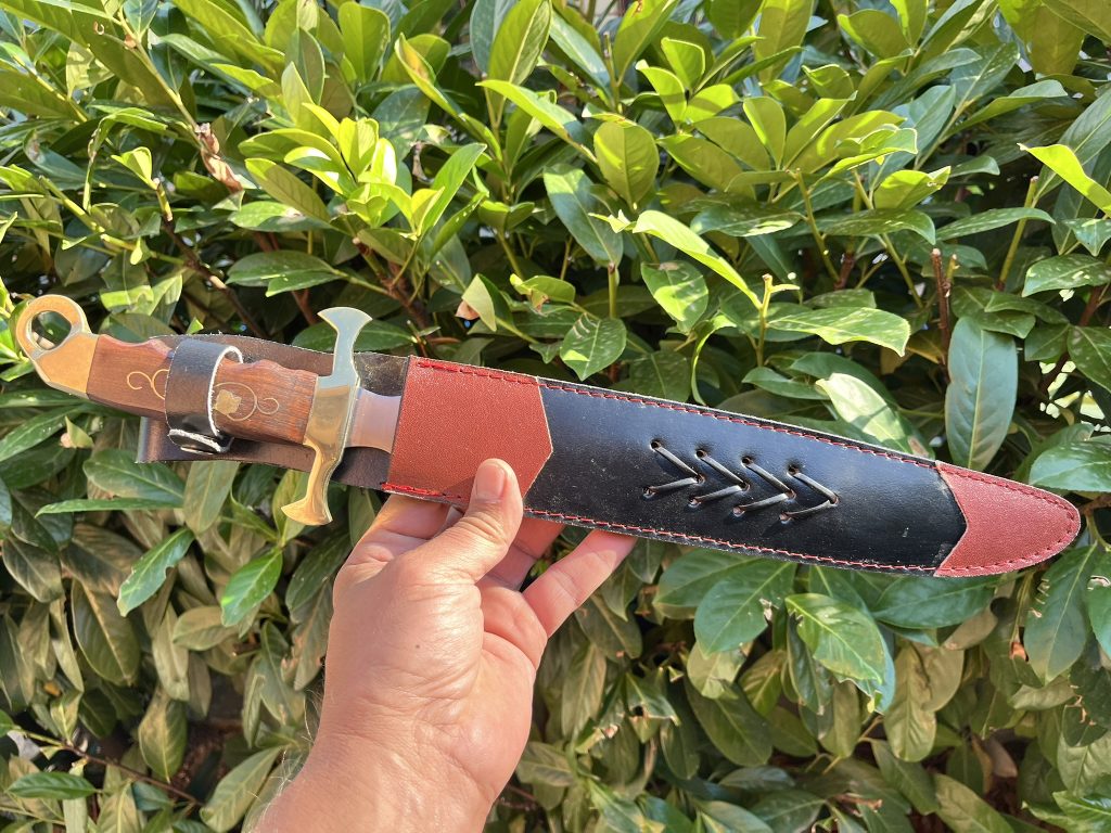 A markolat masszív fából készült, sárgaréz berakással, és bőrtok is tartozik hozzá, amely megóvja és kiegészíti a pengét.