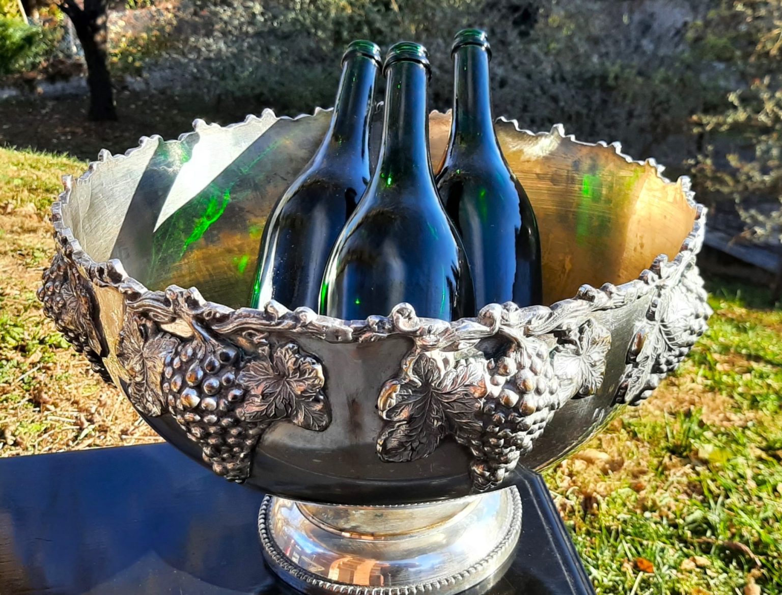 — Lenyűgözően szép, nagy méretű ezüstözött Art Deco jégtál, amely a pezsgő- és borkedvelők igazi álma. Ez az elegáns, 1960-as évekből származó francia darab az Art Deco korszak időtlen kifinomultságát és luxusát idézi, miközben praktikus és látványos kiegészítője lehet bármely ünnepi alkalomnak vagy gyűjteménynek.