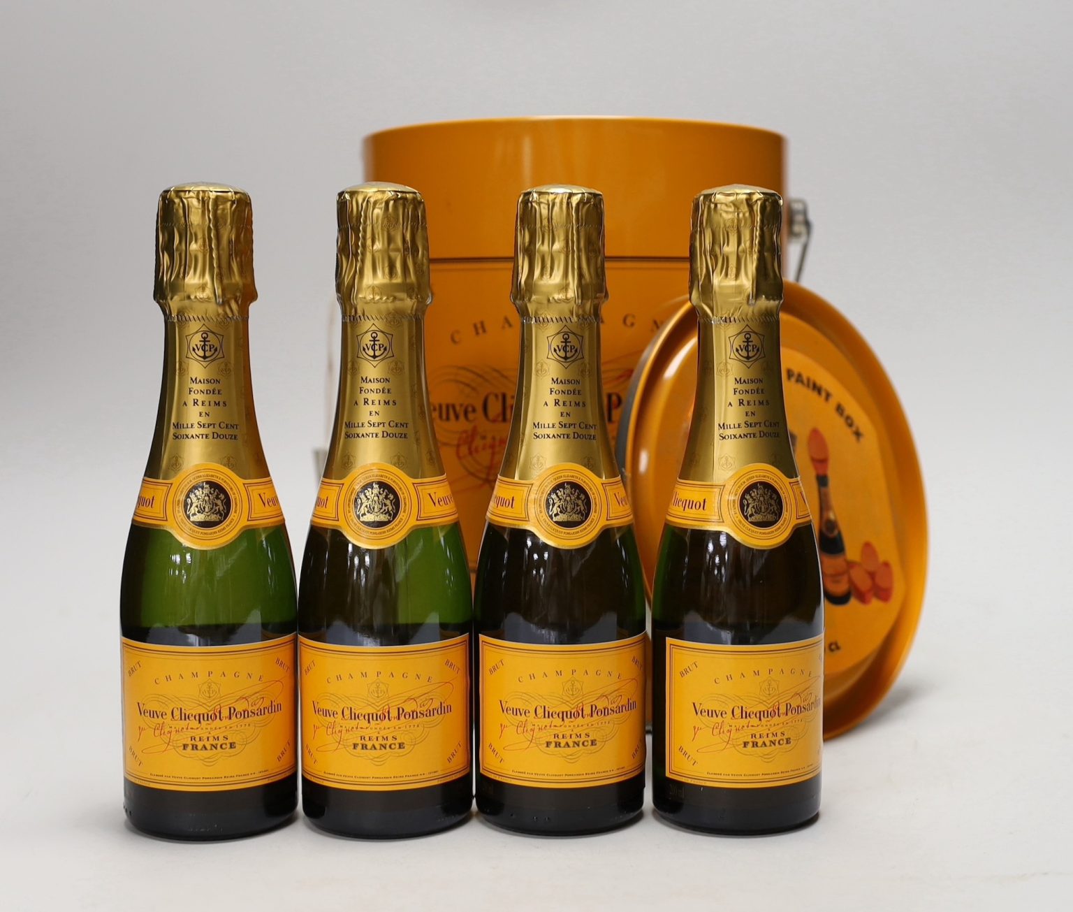 This special and highly collectible set contains four miniature bottles of Veuve Clicquot Ponsardin Brut Champagne, presented in the iconic original yellow metal “paint pot” container by Veuve Clicquot.