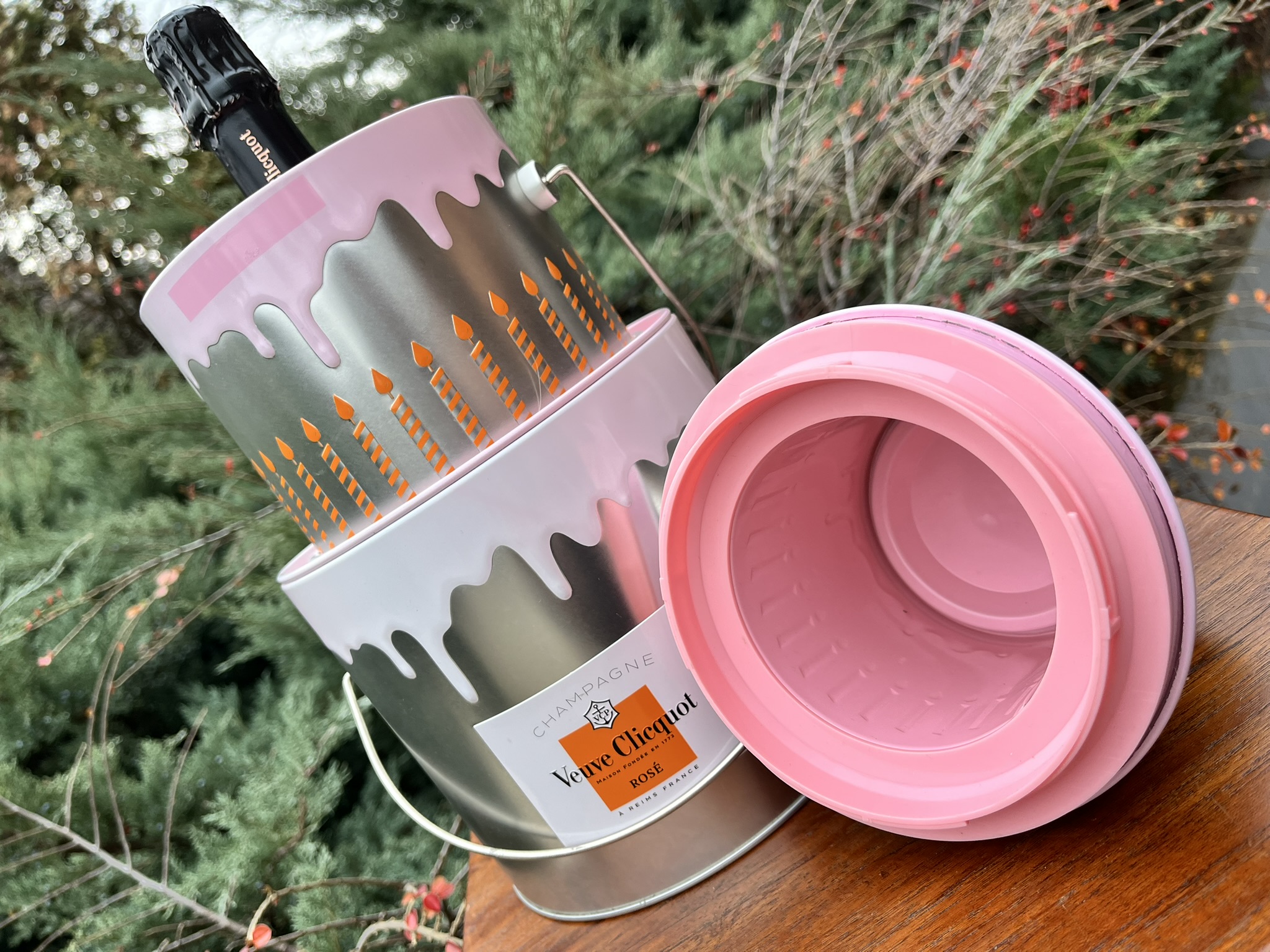 This special, limited-edition Veuve Clicquot “Birthday Cake” Champagne cooler was created to celebrate the 200th anniversary of Madame Clicquot’s invention of blended rosé champagne. Designed in the shape of a three-tier birthday cake, this playful and iconic cooler features a screw-off top that allows you to place a bottle and ice inside with ease.