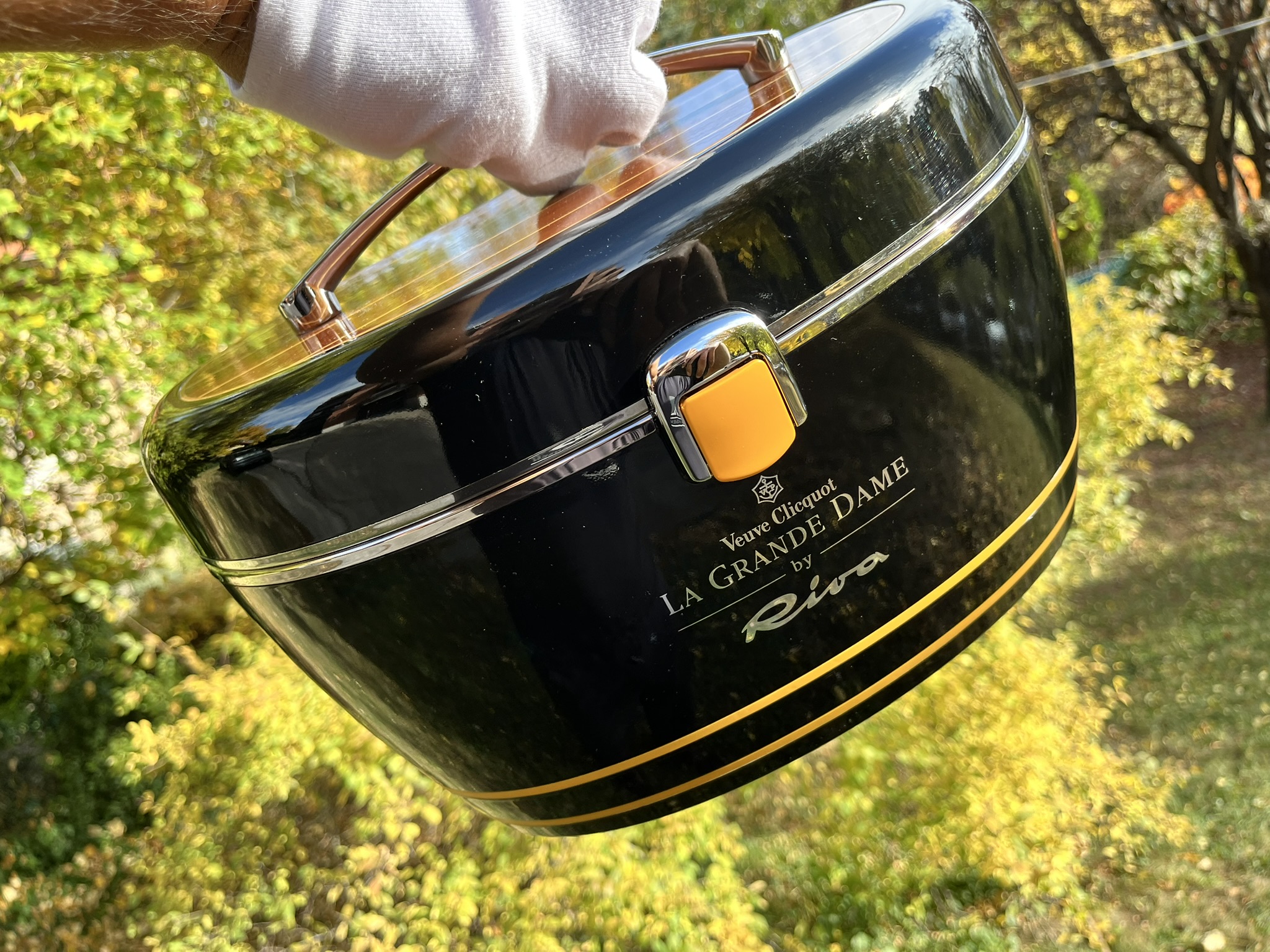 The La Grande Dame 1998 Riva Cruiser Bag limited edition was launched in July 2008 as part of the collaboration between Veuve Clicquot and Riva. This exclusive piece was produced in only 300 examples and originally included a bottle of La Grande Dame 1998 champagne along with two champagne flutes. The bag features a black piano lacquer finish, mahogany marquetry, leather details, and silver-colored accents, reflecting the elegance of Riva yachts.