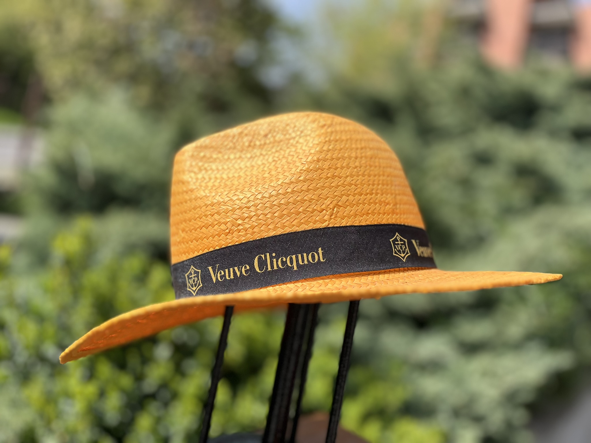 The hat features a sophisticated black band with the iconic Veuve Clicquot “VCP” logo, adding a subtle but recognizable touch of luxury associated with the famous champagne house.