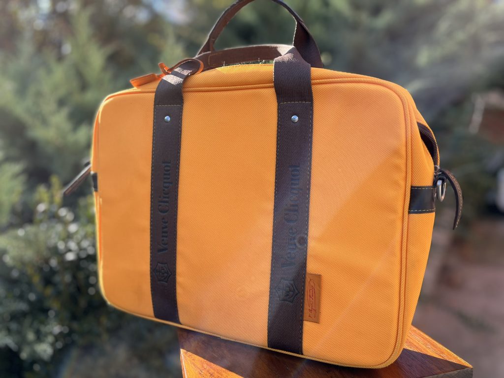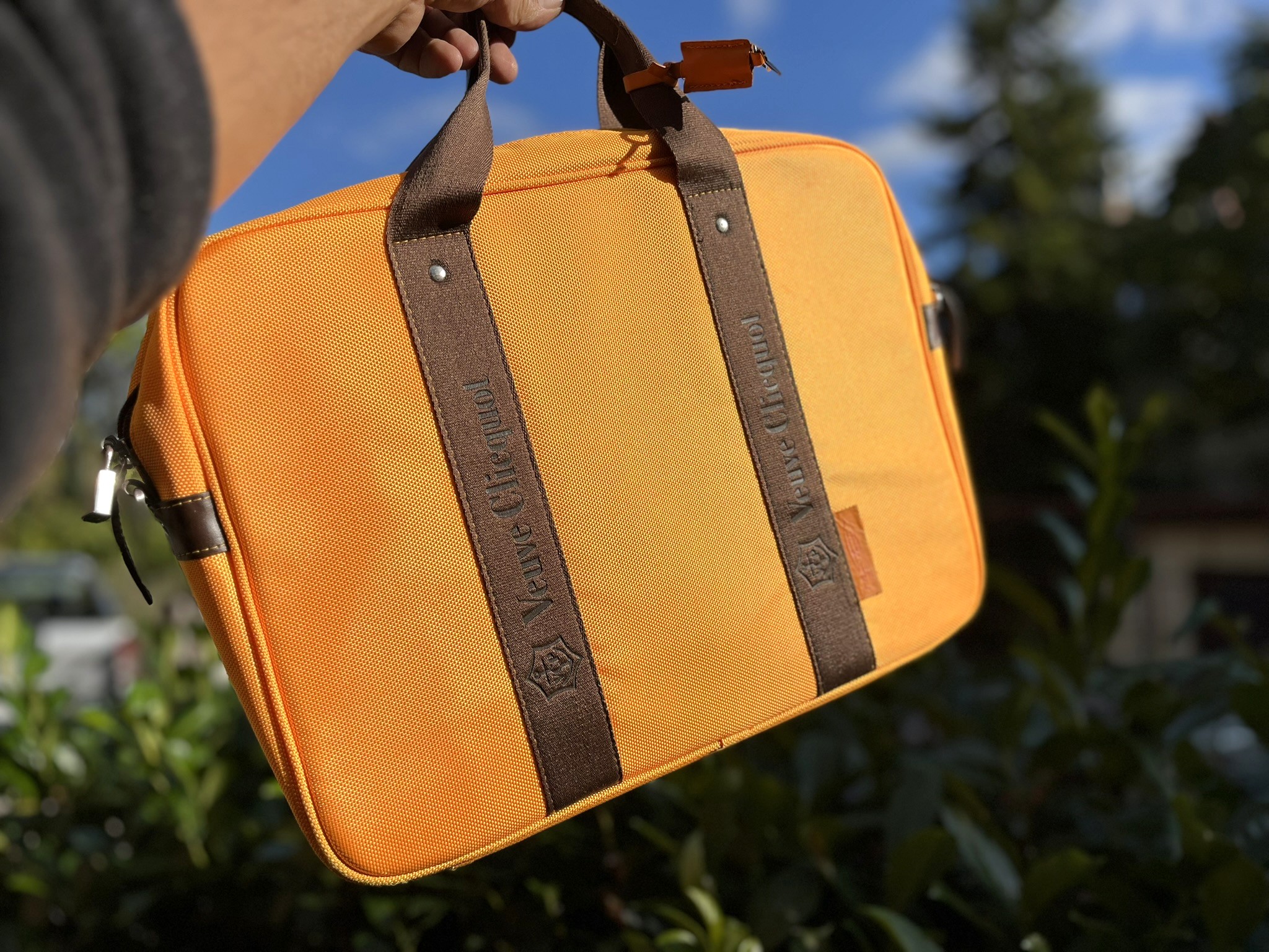 Veuve Clicquot Ponsardin Limited Edition Laptop Bag – Yellow with Brown Accents, Original, Well-Preserved Condition