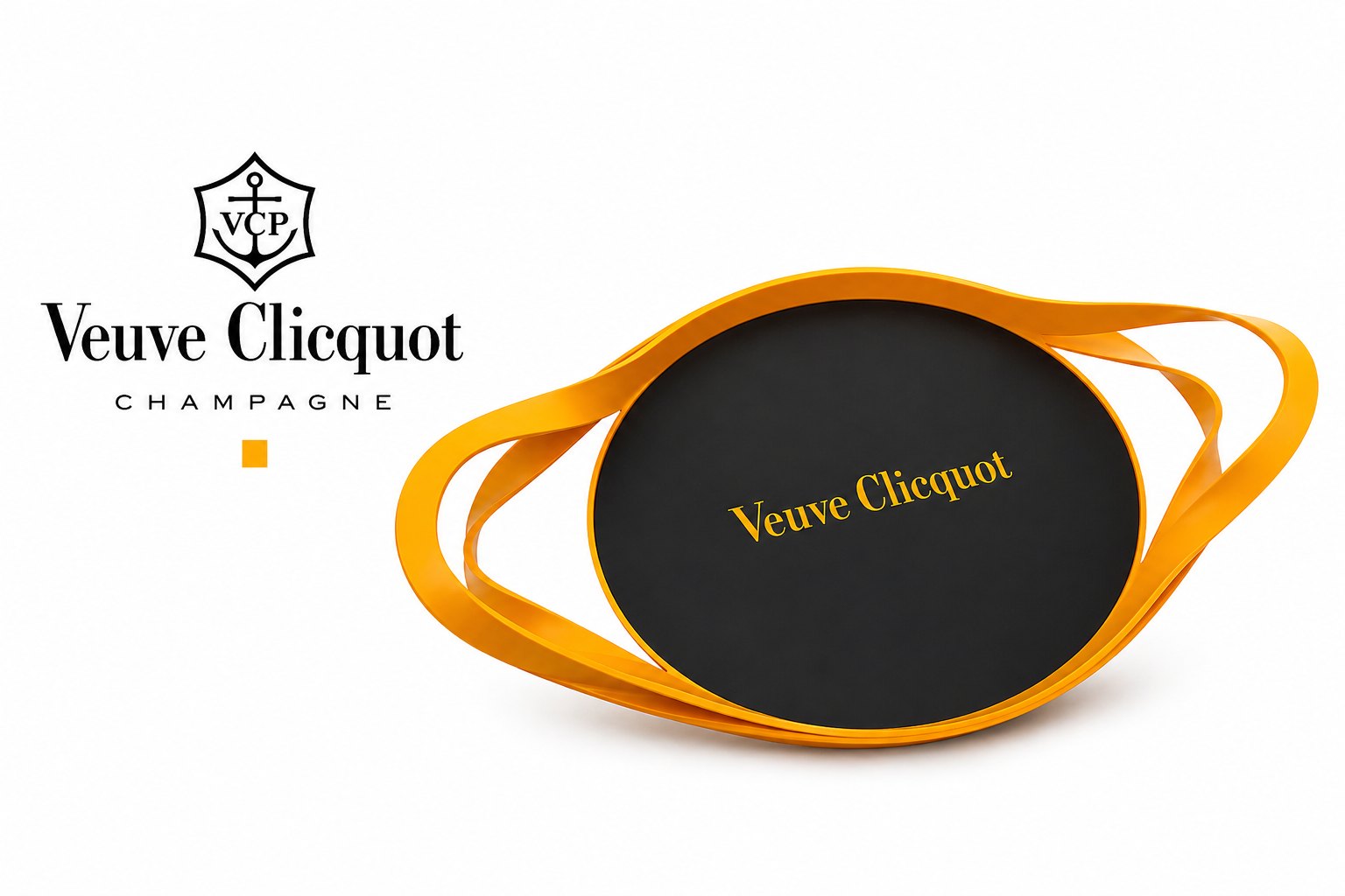 A design középpontjában a Veuve Clicquot felirat áll, míg a karakteres kialakítású fogantyúk nemcsak egyedivé, hanem kényelmesen használhatóvá is teszik a tálcát.