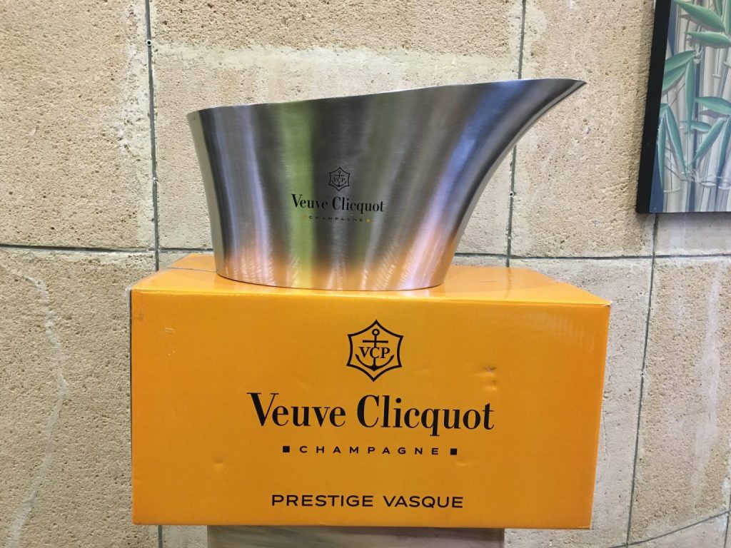 The ice bucket features the embossed Veuve Clicquot logo on both sides as well as branding on the inner surface.
