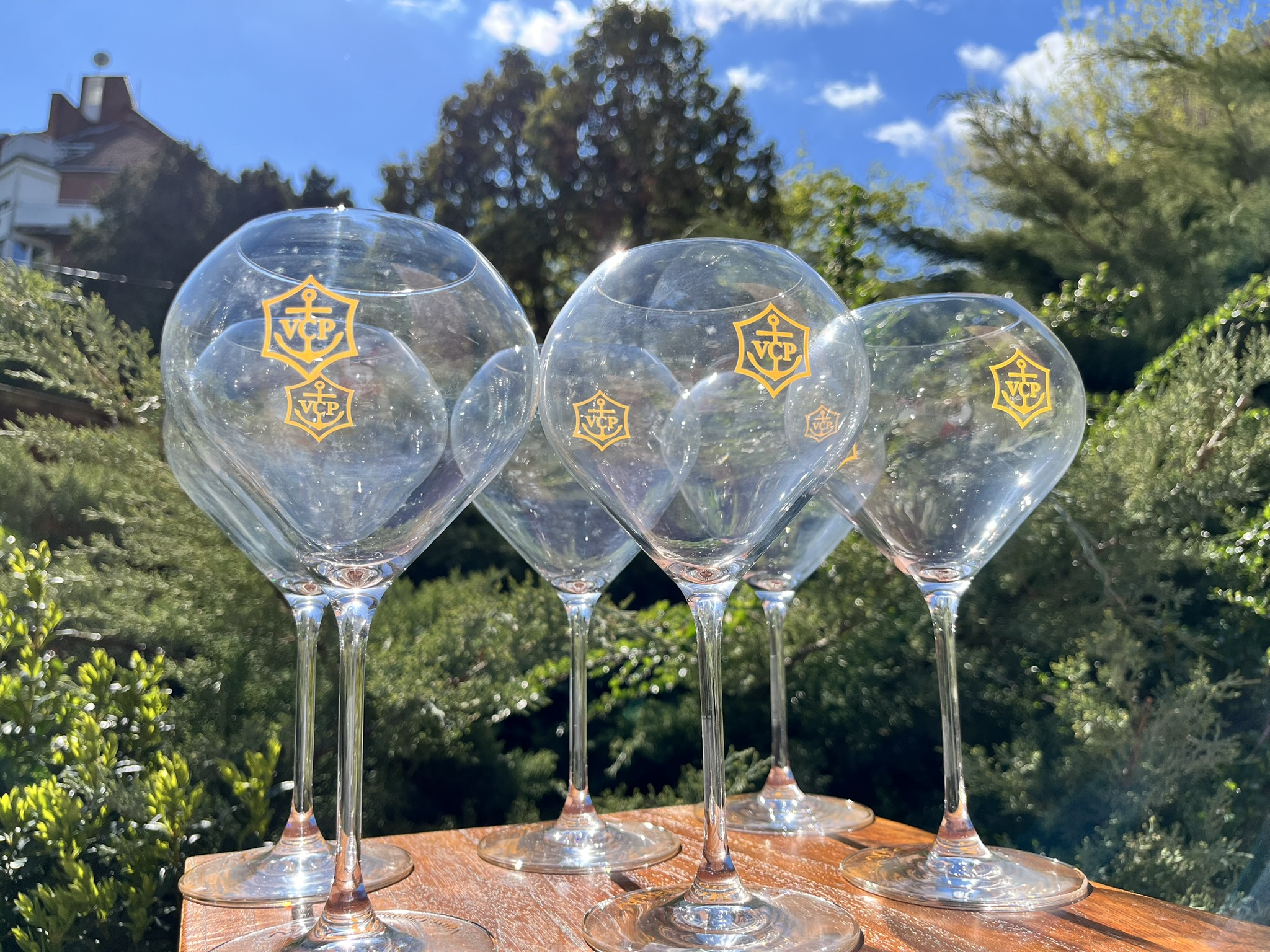 Elegant and rare set of 6 Veuve Clicquot RICH Champagne glasses, specially designed for enjoying Champagne served over ice.