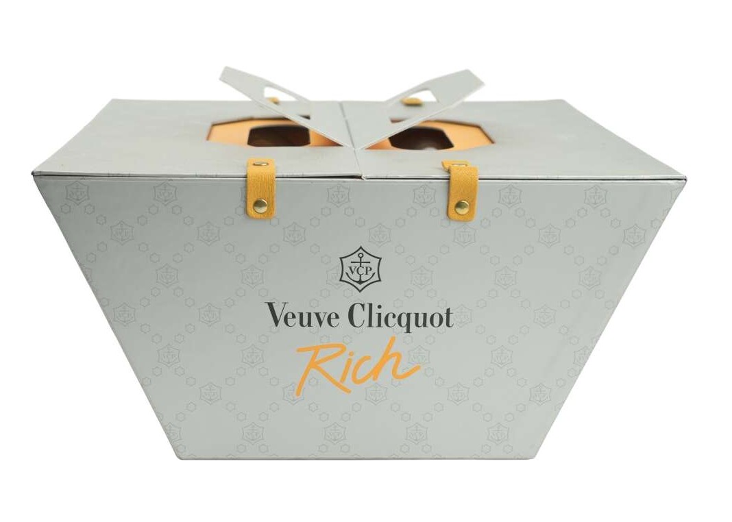 Rendkívül ritka, limitált kiadású Veuve Clicquot RICH piknik kosár formájú ajándékdoboz, két darab RICH akril pezsgőspohárral.