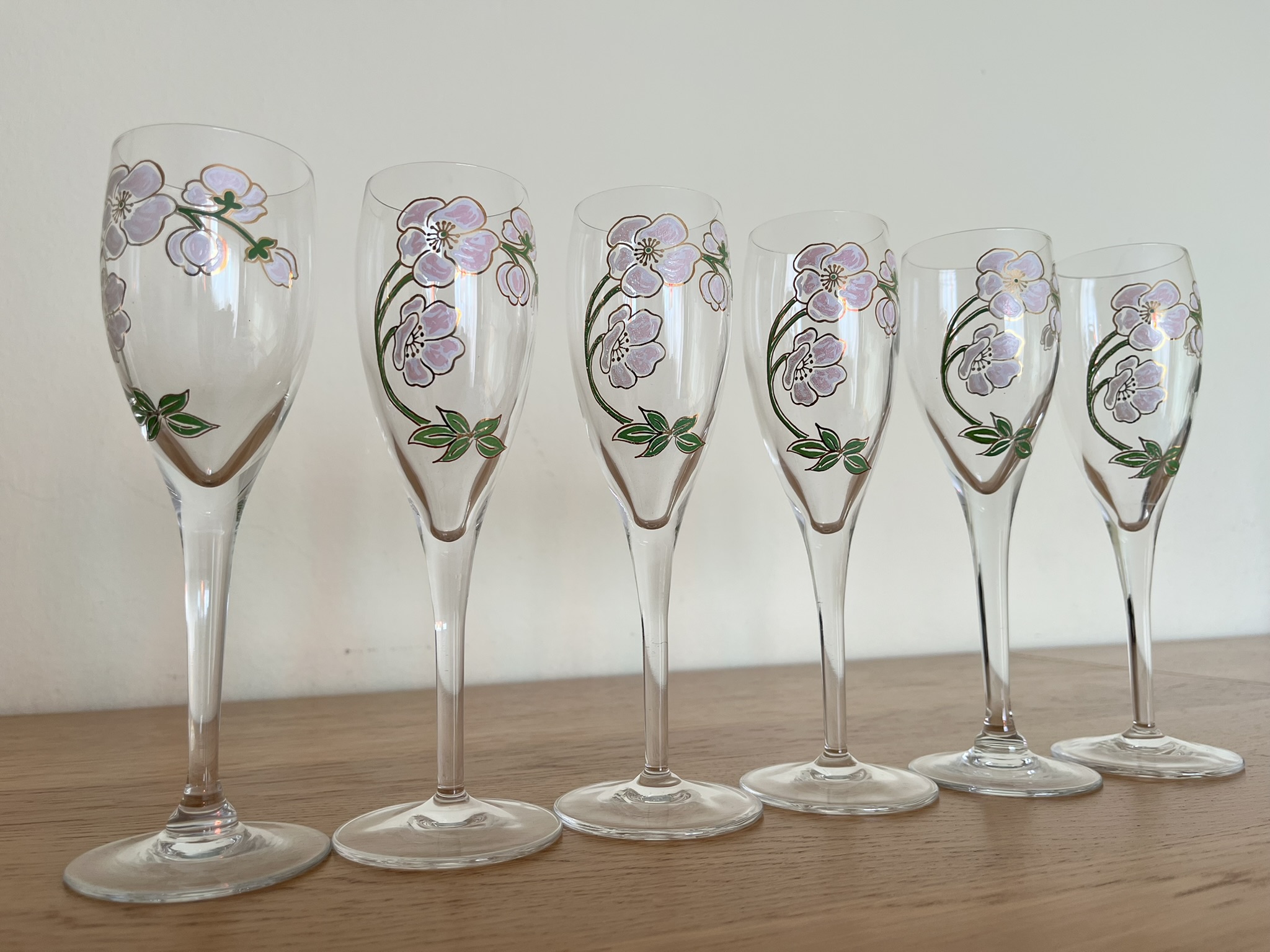 Both decorative and functional, this set is ideal for festive occasions, elegant table settings, or as a standout addition to any collection. The clarity of the crystal, the finesse of the painting, and the timeless elegance of the form make these glasses captivating even today.
